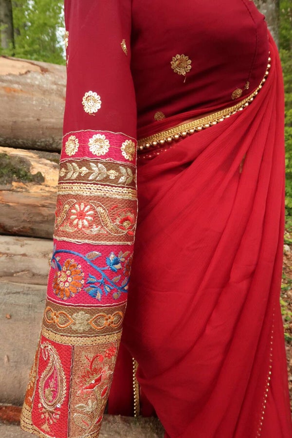 Multi-colour sequins and thread works on deep maroon georgette handworked blouse with ruby chiffron saree. Full sleeves blouse with diamond shaped back.