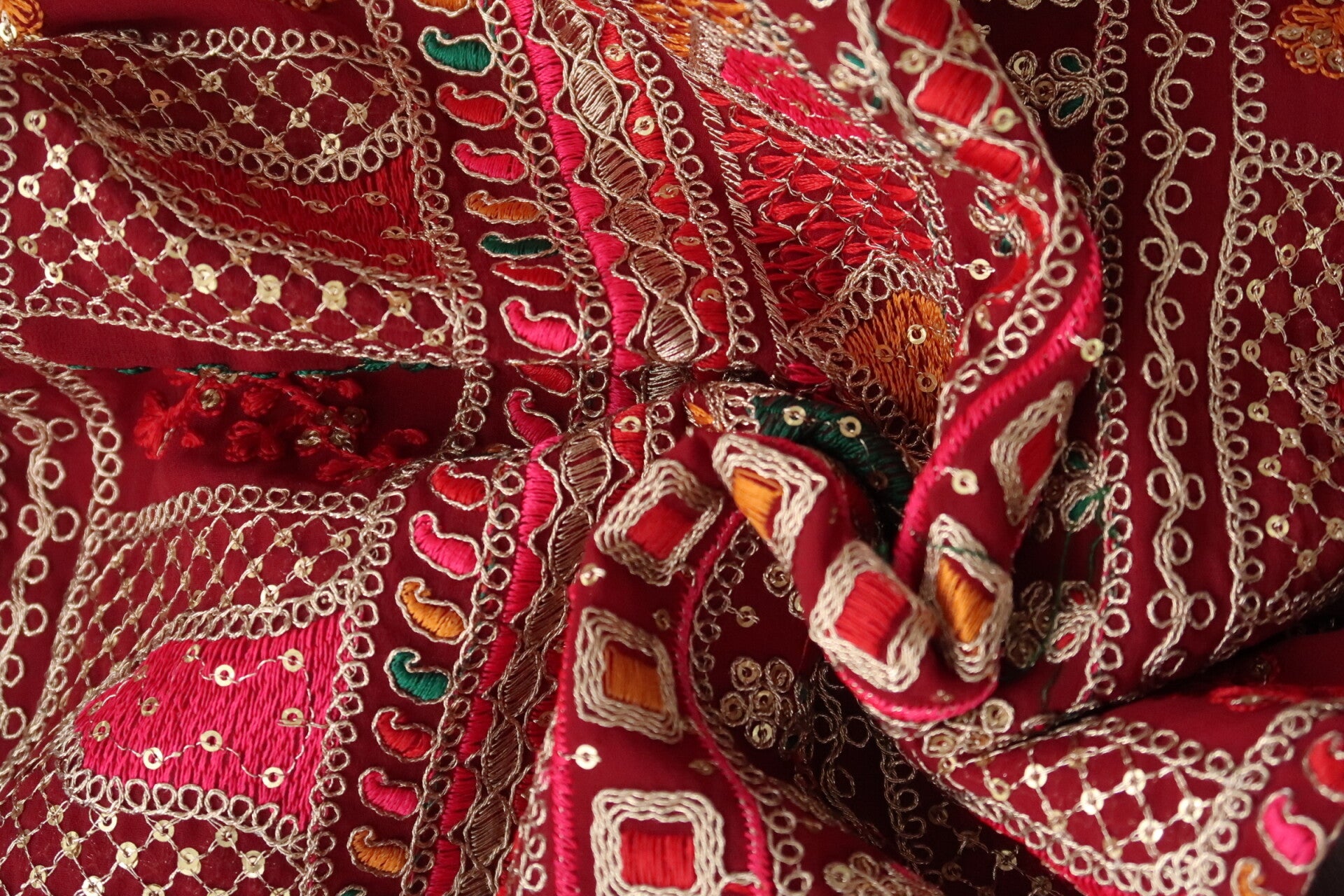 Multi-colour thread and sequins embroidery works works on deep maroon georgette blouse with matching chiffron saree. Elbow sleeve blouse with closed back.