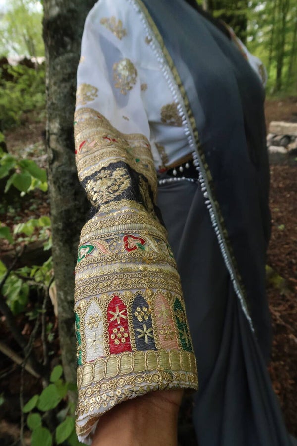 Multi-colour sequins and thread works on white georgette handworked blouse with grey chiffon saree. Full sleeves blouse with diamond shaped back.