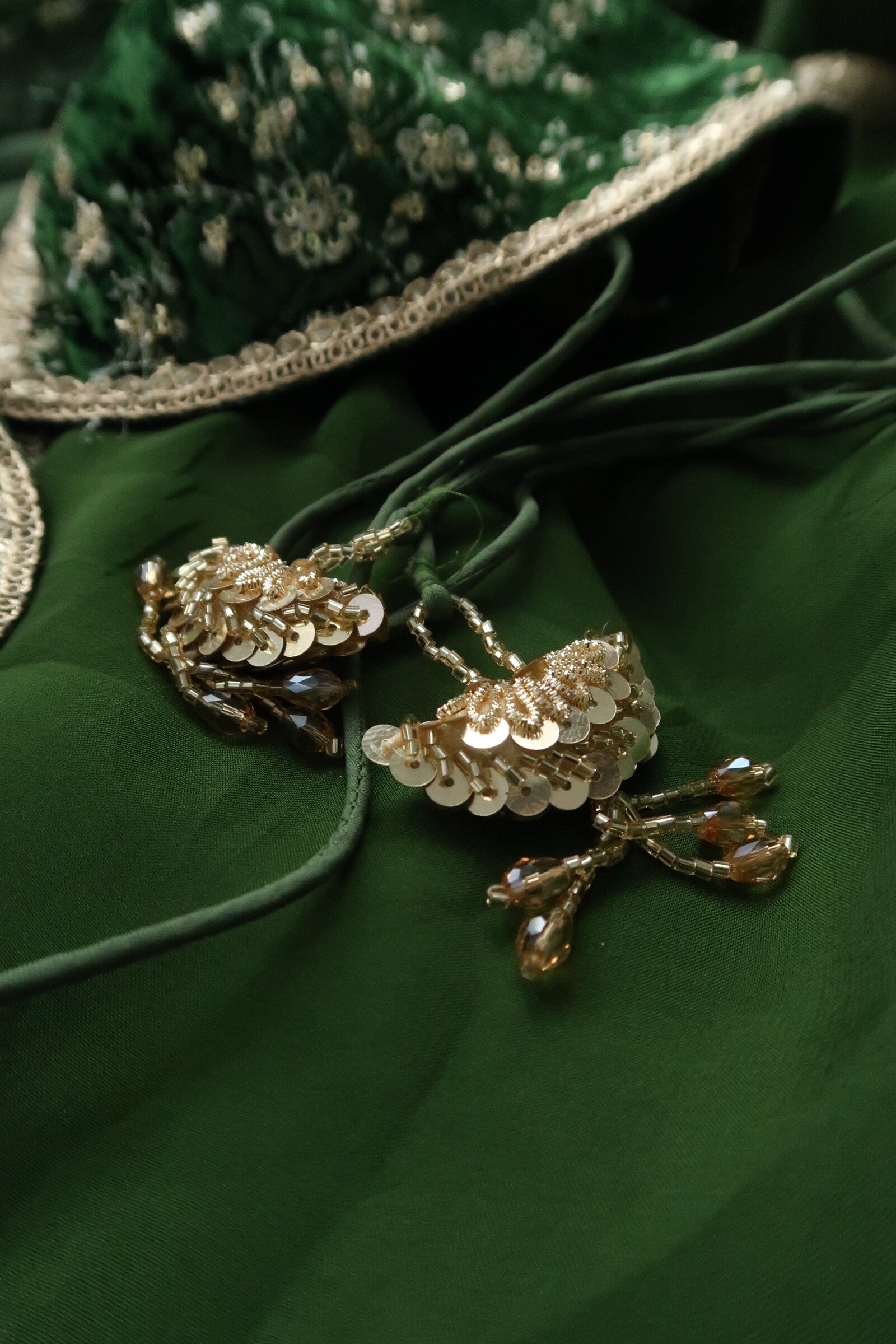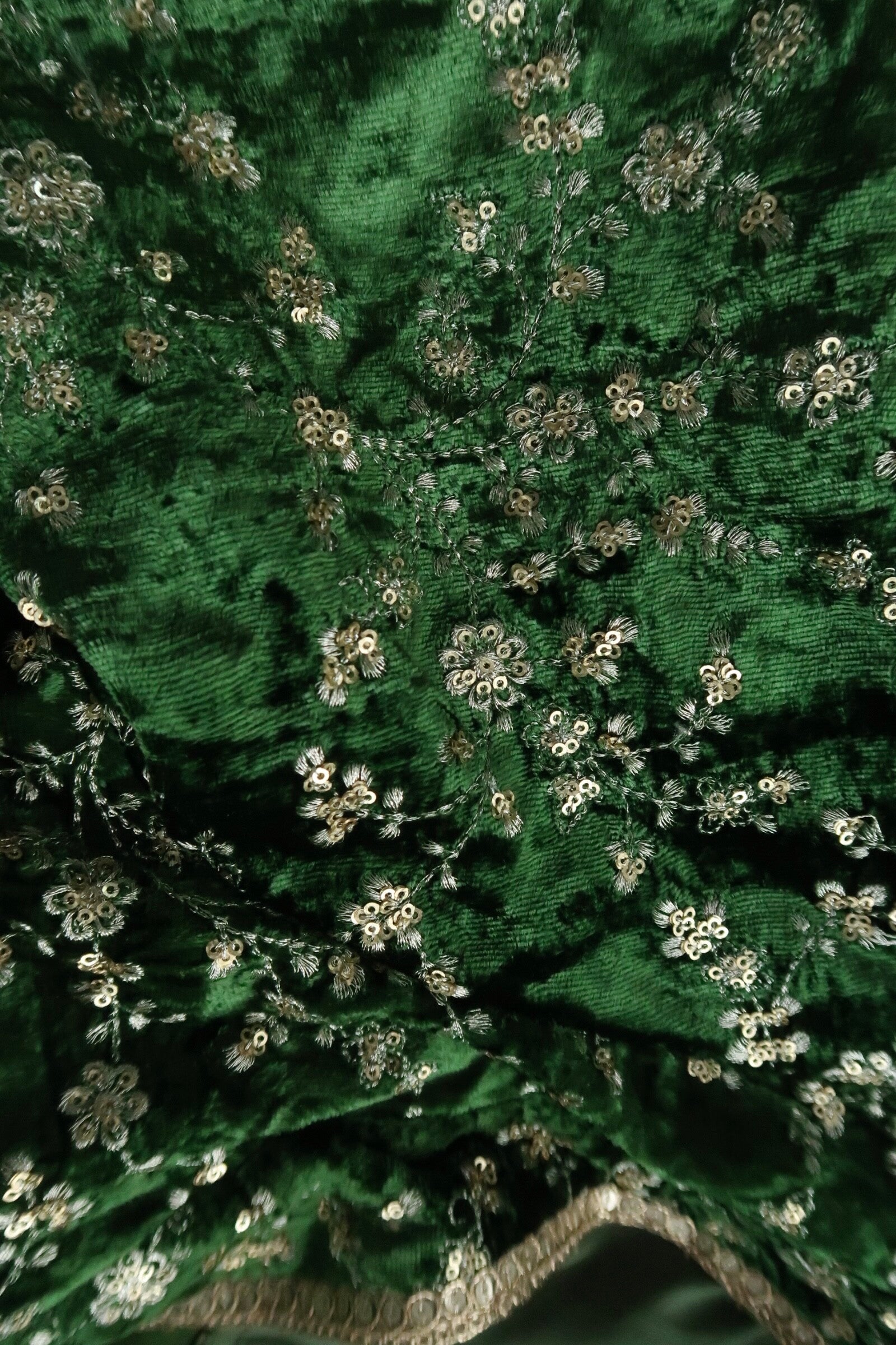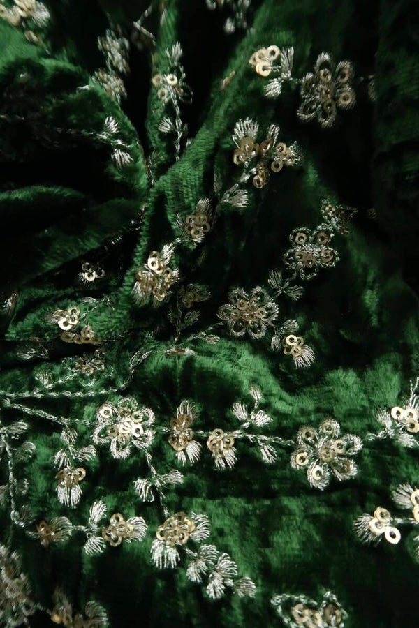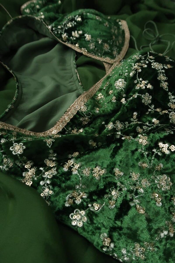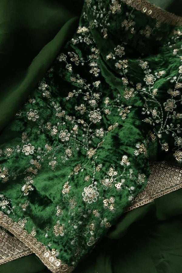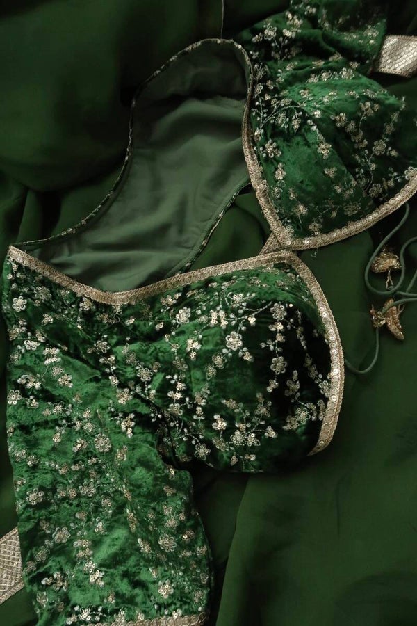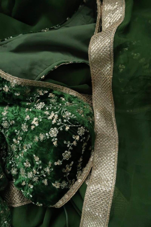 Our olive green embroidered velvet blouse includes a pure organza saree. Embroidery is present on this style using zari, sequins, and stone work.
